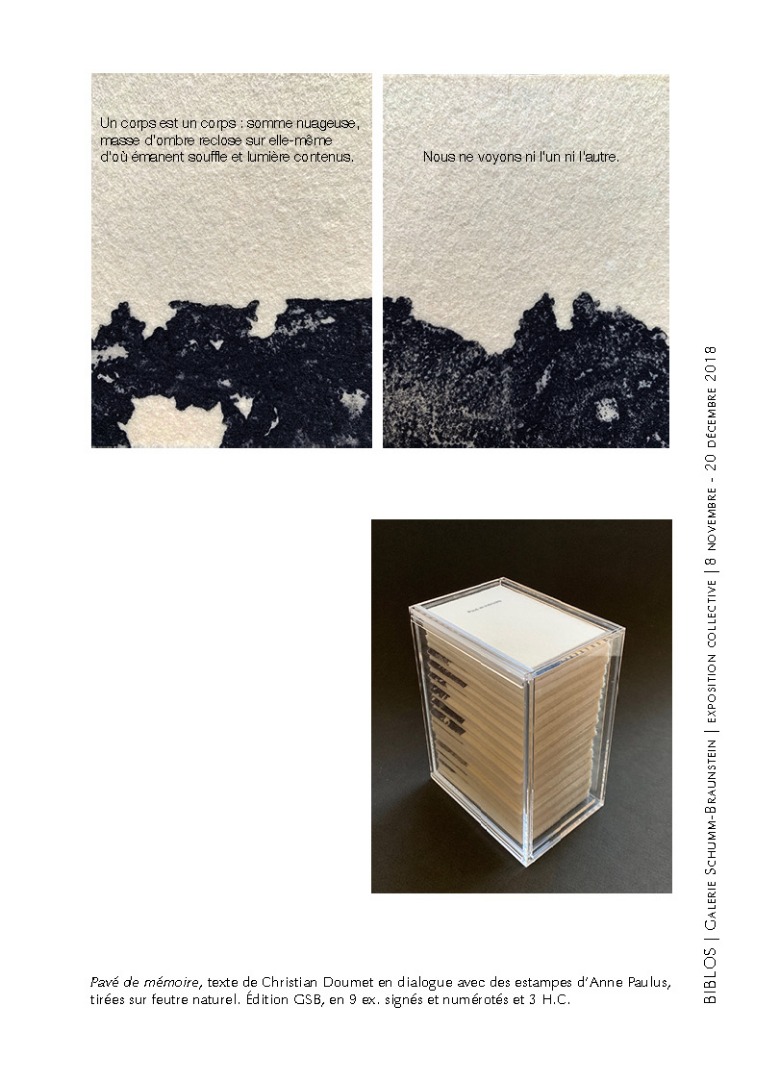 Une exposition de sept artistes familiers des lieux entoure la sortie de deux nouveaux livres d'artiste par la galerie. Le premier, Biblos, réunit les photographies du port de Sète de Jacquie Barral avec un texte de René Pons pour nous entraîner loin dans l'histoire de l'art et des hommes. Le second, Pavé de Mémoire, couche les phrases de Christian Doumet sur un feutre illustré à l'encre par Anne Paulus. Des estampes d'Eric Fourmestraux, d'Alain Clément, une sérigraphie de Christel Valentin, un flipbook d'Horacio Cassinelli, se prêtent au jeu collectif de la correspondance entre les œuvres et des mots d'écrivains. Des livres s'ouvrent, les sens ricochent sur les murs... Un jeu libre, intelligent et sensible.